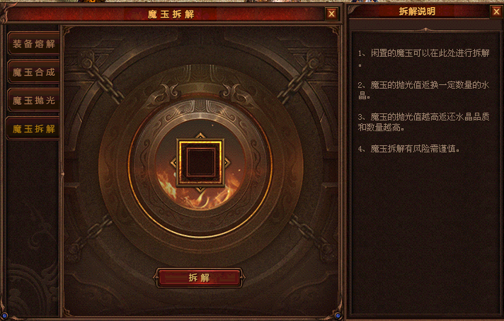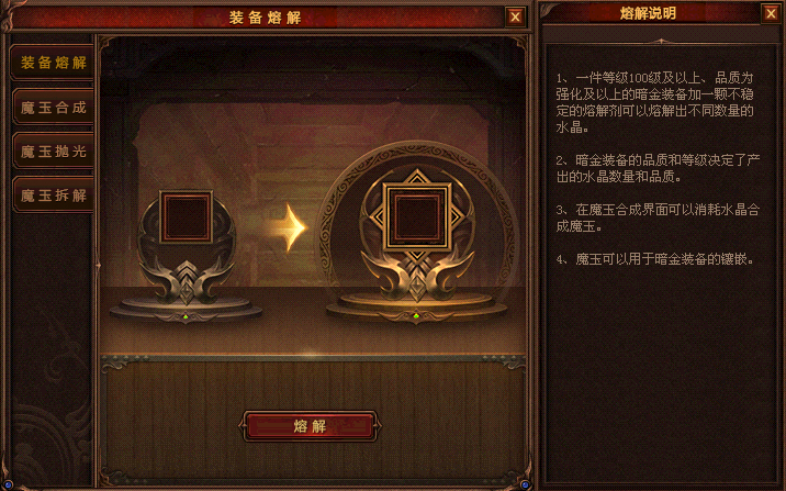 魔玉系统包含:装备熔解、魔玉合成、魔玉抛光和魔玉拆解