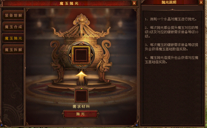4、魔玉可以进行抛光,每次抛光消耗一颗水晶并提升魔玉等级1级,魔玉等级提升后对应镶嵌需求装备等级会提升10级。